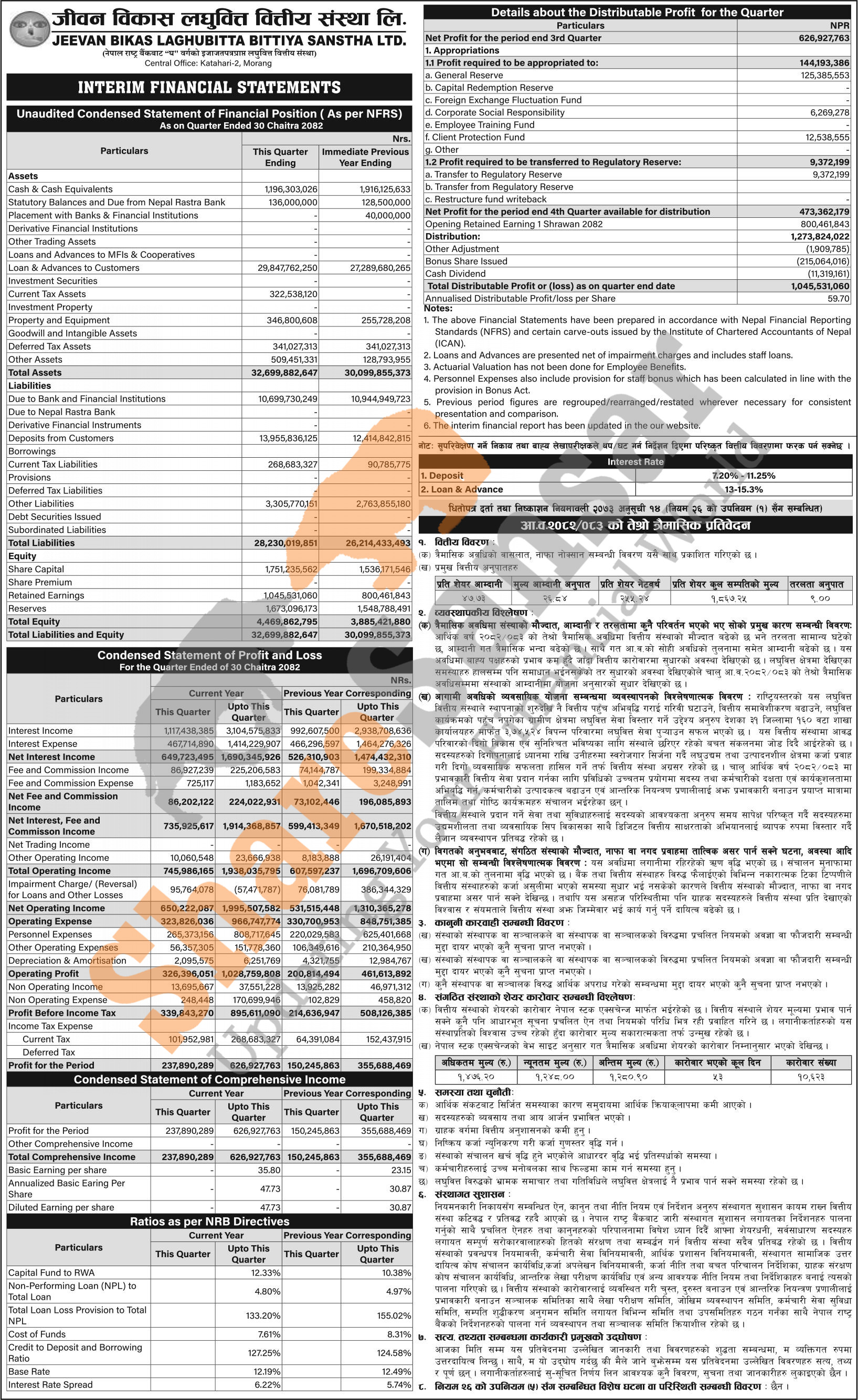 Jeevan Bikas Laghubitta Bittiya Sanstha Limited has posted a net profit of Rs 626.92 million and published its 3rd quarter company analysis of the fiscal year 2082/83.