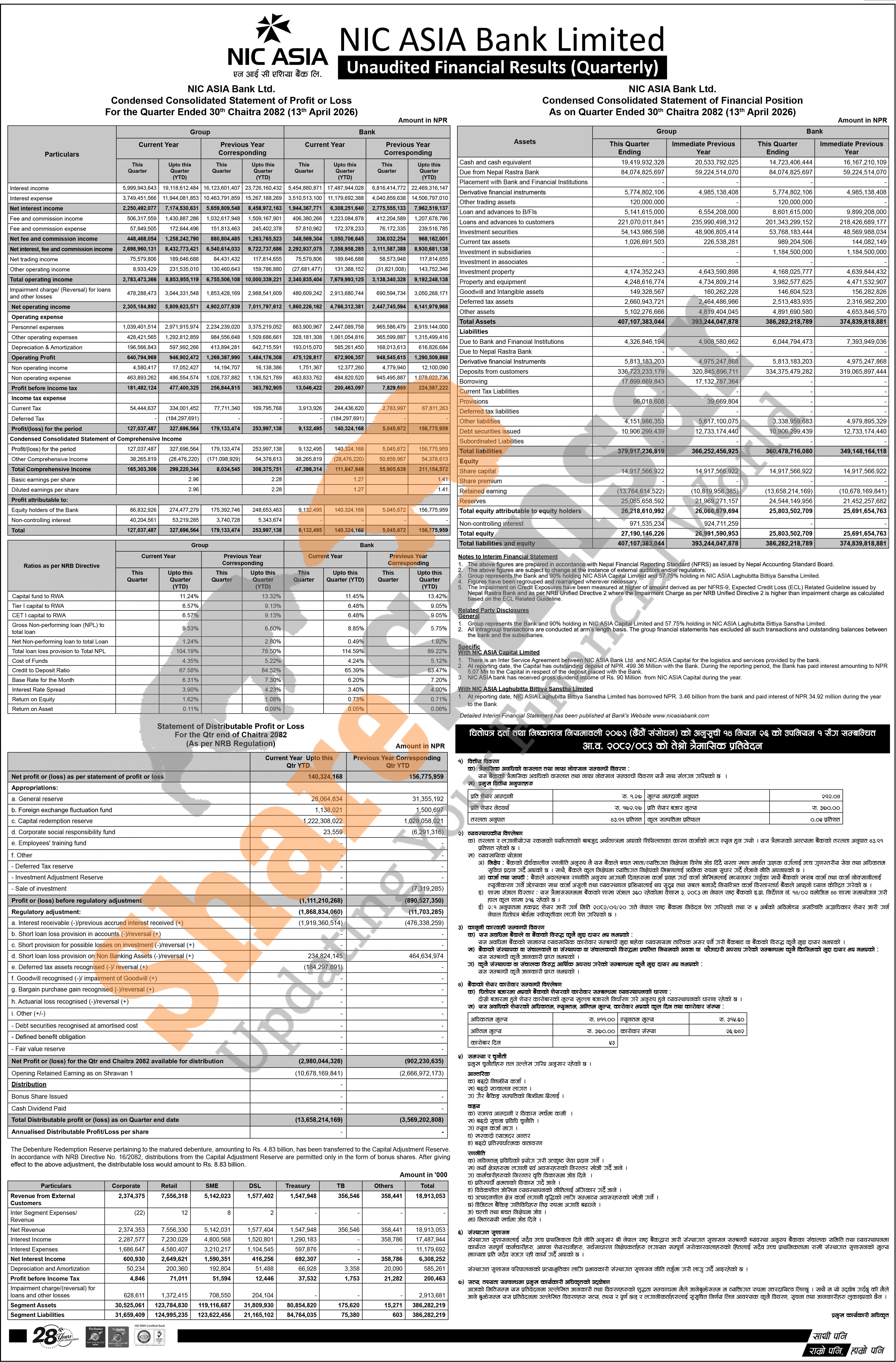 NIC Asia Bank Limited has posted a net profit of Rs 140.32 million and published its 3rd quarter company analysis of the fiscal year 2082/83.